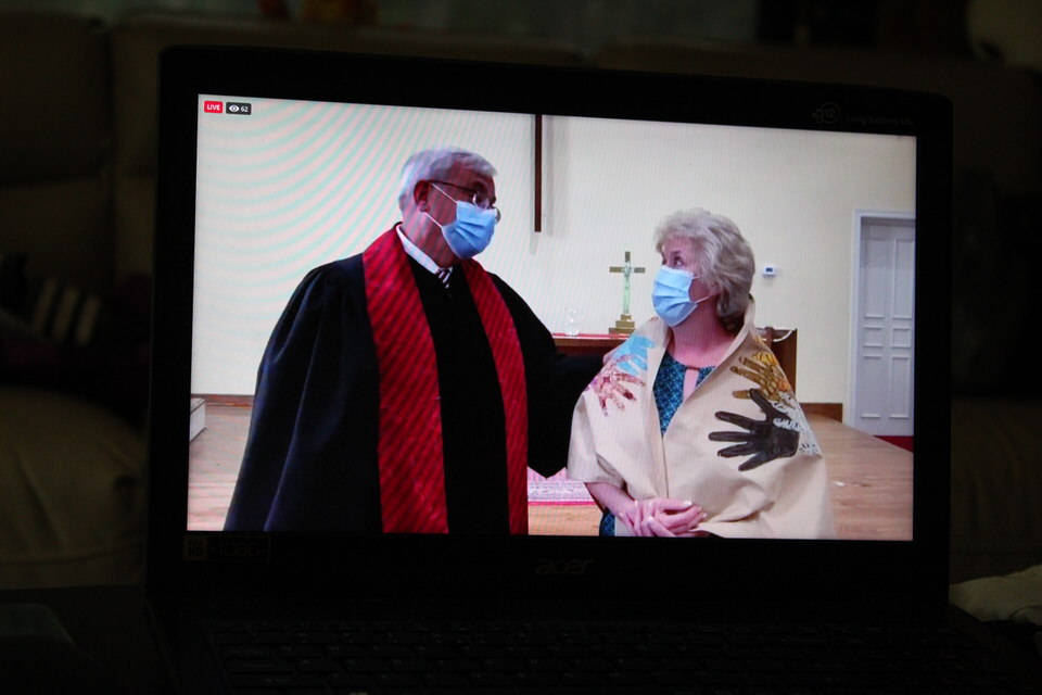 A highlight of the service was the installation of the church’s new elders and deacons. At one point in the installation service the current leaders usually come forward to lay hands on those who have been newly appointed. That, of course, was not possible today. So, everyone currently installed as leaders at some point dipped their hands in a dish of paint and then left their hand prints on a special shawl. . . .