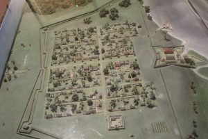 A diorama of the original town. The fort is to the right. A wall and a moat enclosed the entire town.