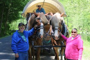 Our two horsepower team. I’m standing with Doug and Ms. Barbara is standing with Ike. They are Belgian Draft Horses and are 6 years old. They were purchased from an Amish farmer in the area and they will continue to work pulling the wagon until they are about 15 years of age. When they reach that age they will be sold to either the original owner or another Amish farmer who will continue to use them to do light duty work such as pulling a mower or plowing a garden. They are never sent off to the glue factor. The tour has a total of 6 teams of horses that they rotate on a daily basis. In the background holding the reins is the owner of the tour, Brad.