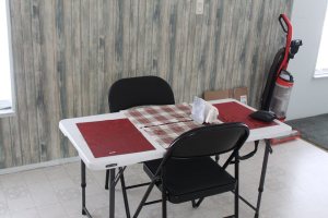 This is our current breakfast nook/dining room table and chairs. This furniture is not due to arrive until sometime in August. We’ve been cooking in the house and eating there as well. By cooking in the house it keeps the heat down in Elvira.
