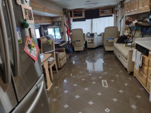 The floor has been steamed cleaned. Now, it is just a matter of putting all the odds and ends back in place. I’ve also checked all the fluids, lubricated all the slide seals, and on Wednesday I’ll make sure the tires are at the proper pressure. Come Thursday morning we’ll be back on the road. Yipee!