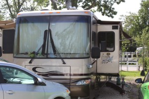 This is our new home for the time being. Before we arrived they put down a new gravel base and made sure it was perfectly level. Now, how about that! They also installed a new electrical pedestal. All other utilities are adjacent to the wet bay so hook ups were no problem. The site is also satellite friendly so we have our TV for the time we are here. However, getting the TV to work, rather make that getting DISH to work correctly, took over 45 minutes of Ms. Barbara’s time on the phone. But all is well that ends well.