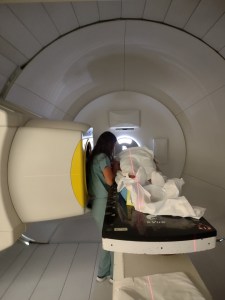 Another week of treatment is in the books. I have just twenty seven more times to get zapped by protons moving at 2/3 the speed of light. I’m also getting really good at knowing once I’m on the slab when the whole process begins and ends. When they are ready to activate the gantry you’ll hear what sounds like a doorbell. This means it is time to clear the room for the beam is being turned on. Then, at the end of the treatment you hear what sounds like a jet engine spinning down. Once the sound stops the gantry is off and it is safe to enter the room. Then it is off the slab and double time to the bathroom.