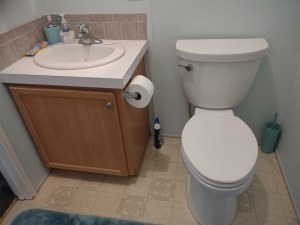The first project was replacing the old toilet. Oh, all that stuff on the seat – that was yet another project. Regarding the toilet, it was leaking around the base and it was too low. We decided to change it out for an ADA toilet. Translated, we decided to install what is known as a chair height toilet. This type of toilet is a good two inches higher than standard thus making it easier for those with bad knees – meaning the two of us – to stand up from. Ah yes, another sign of getting old.