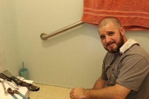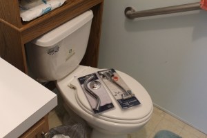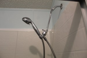 Remember all those parts on the toilet seat in an earlier picture? They were used to lower the shower head down to where we could actually grab it. Before, you had to be at least six feet plus to get to it!