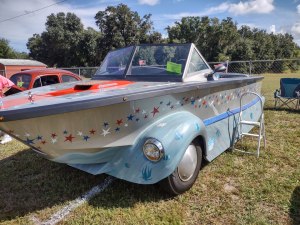 Yes, it is an actual boat mounted on a Ford van chassis. But no, it doesn’t float!