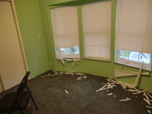 Well, that of course meant that Proton would be left home by himself. This is normally not an issue. We have left him home alone numerous times in the past without an issue. However, this time while we were gone a severe thunderstorm rolled through the area. Now, whenever he gets scared his first instinct is to try and find me. Not finding me in the house he next, it appears, tried to find me outside. The problem was the front blinds were down and he could not see out. But that was not going to stop him. The result is what you see above. I can only imagine how scared he must have been. I just didn’t have the heart to scold him. The blinds were due to be replaced soon anyway. They were plastic and had gotten brittle from the sun.