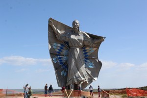 Representing the rich Native American culture of South Dakota, the 50-foot Native American woman gracefully wears a dress patterned after a two-hide dress of the 1850s. She holds outstretched a quilt featuring 128 stainless steel blue diamond shapes designed to flutter in the wind. During the day, her star quilt – a representation of respect, honor and admiration in Native American culture – glitters in the sun with color-changing pieces that move with the wind. At night, LED lights cause the diamond shapes to glow in the night sky, casting a peaceful presence easily visible from the Interstate.
