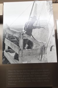 Deep drilling to prepare for blasting away the outside rough rock. Think about it, you are suspended in a simple sling chair, holding a jack hammer, trying to drill holes into solid granite. I saw a video of someone who was assigned this task and he stated that he usually had to chain himself to the mountain so that he could get enough purchase to drill a hole.