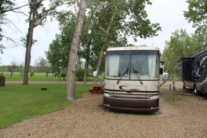 and this is where we ended up. We have a pull-through, gravel base and level. Since we’re here only for the one night we only put the back two slides out. Likewise, we only hook up electric. The nice thing about this site? As you leave, make an immediate right and you go right out to the exit for the park.