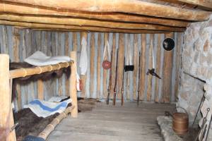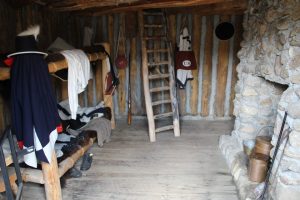 Again a soldiers quarters this time with wood working – saws, axes, shaving horse (bench) – tools. Unfortunately, wood was also scarce around the Fort. The area had been so long settled that fire wood could only be found a great distance from the Fort.
