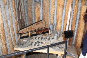 Again a soldiers quarters, this time displaying musical instruments, games, drinking and dining utensils. When expedition members had free time, they most often spent it with their neighbors, either hosting them at the Fort or going over to the Mandan town, Mitutanka. A journal entry mentions that the Mandan Nation found the dancing of expedition members most interesting.