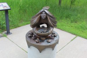 This sculpture is entitled Heartwaters-Caretaker Women. In Ojibwe belief it is the women who are the Caretakers of the Water. Here’s what I learned about this sculpture: In this sculpture, a woman is leaning over releasing a small clutch of turtles from a basket, renewing the seasons and continuing the waters of life. Her flowing hair is like flowing water.
