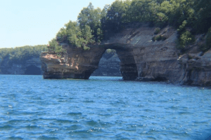 This is known as Lovers Leap. It features an impressive arch that juts out from the shore line to an outcropping located directly in Lake Superior. Local lore has it that a couple displayed their love for one another by leaping off the arch together. However, the fact is the water under the arch is only three feet deep. Therefore, I would not suggest trying to recreate their act of love.