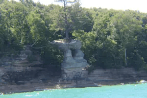 This is appropriately named the Flower Vase. It is narrow at the base as it protrudes out of Lake Superior and widens at the top with trees lining its peak.