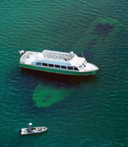 The Bermuda is a 150 foot wooden schooner that foundered and sank in 1870 in Murray Bay on Grand Island. Her top deck is just 12 feet below the water’s surface where she has remained for 128 years.