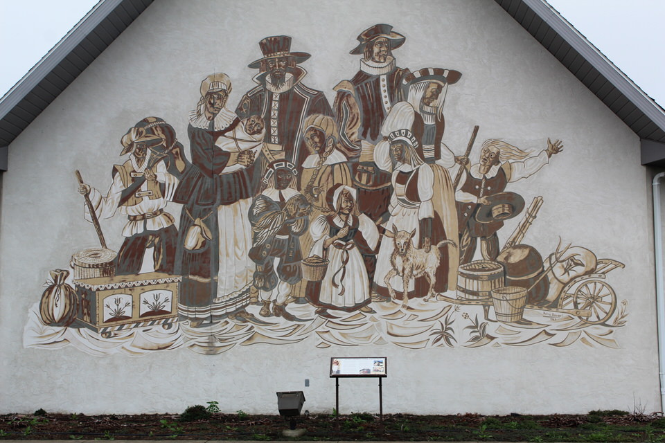 As you enter the parking lot your eye is naturally drawn to this mural on the face of the main building. The scene depicts 18th century immigrants arriving in the New World. It shows them arriving with all their worldly goods ready to start life anew in a new world.