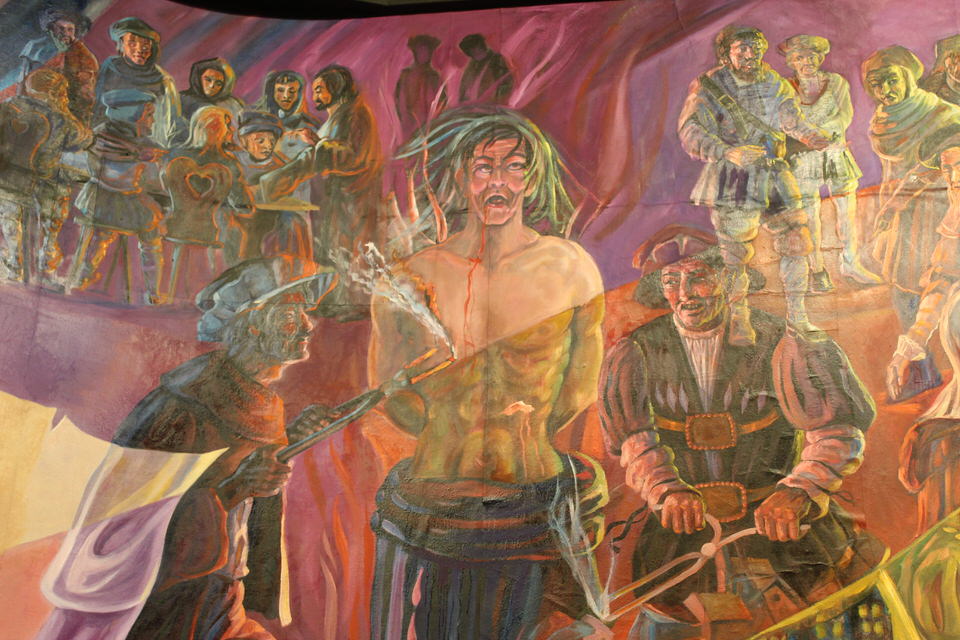 Thousands of followers of the Anabaptist faith were persecuted, imprisoned, tortured and burnt at the stake for their faith. Many of them at the time of their death would testify to their faith. This is a portrait of the death of Michael Sattler dying for his faith. To prevent him from testifying when he was burnt at the stake, they first cut his tongue out. Eight days after his death his wife was put to death by drowning.