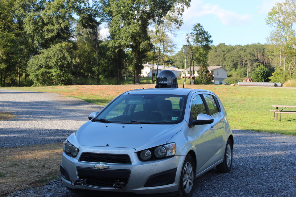 At first we couldn’t find a spot where Albert could lock on to the satellites. So, I moved the car back to the front of the driveway, put Albert on the roof, and now he is a happy camper locked on to all three satellites!
