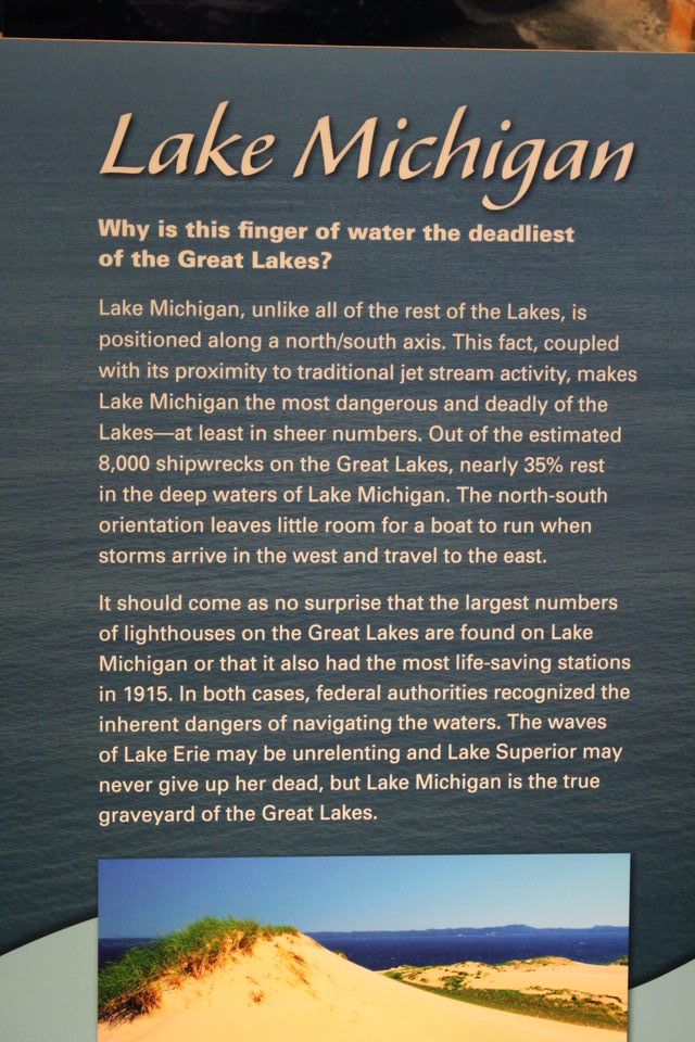 Bill, this is a terrific post! I wasn’t aware of this museum; it sounds really interesting and well done. I was surprised that 28,000 people have been rescued on the Great Lakes since 1982. That seems like a really large number, and why did they need to be rescued? I guess I think of olden times as times of more danger on the Great Lakes. The life jacket info was also fascinating. I have visited 3 of the 5 lakes – missing Huron and Ontario. We did visit Niagara Falls, but I didn’t realize how close we were to Lake Ontario. I am putting these last 2 lakes on my bucket list (can’t have you beating me on this!) as well as this museum. Lastly, I have a similar wood relief map of Lake Michigan. Michael and Allie gave it to me one year for Christmas. It’s proudly displayed in our living room. Thanks for a great post!