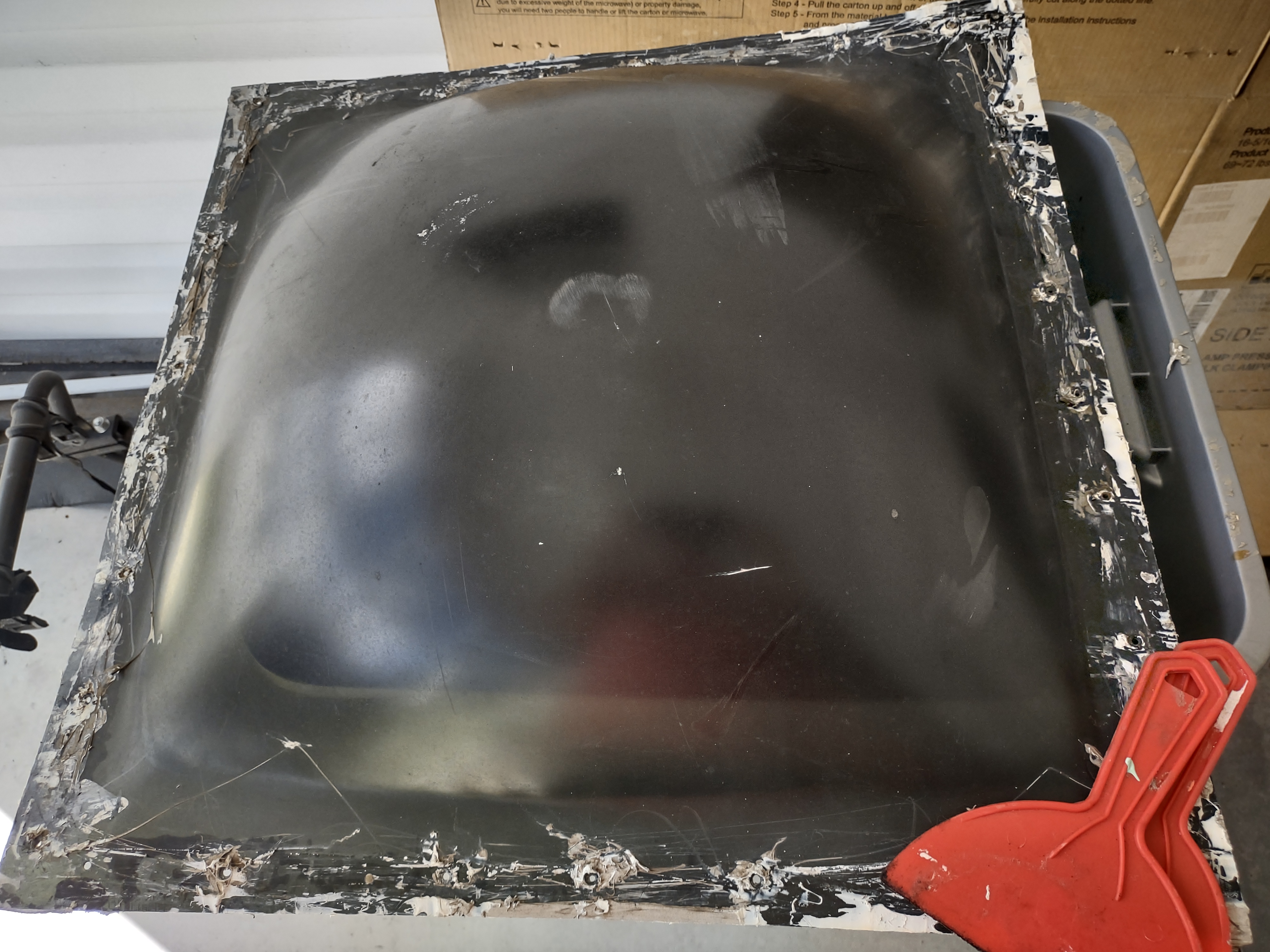 But we weren’t done. There were a number of screws from a previous antenna install that we removed, then re-caulked the holes and inserted new screws. We pulled the air horn off, re-caulked, then reinstalled it. We did the same for the current satellite antenna, a couple of existing cover plates and the defunct solar trickle charger. If it was in the front part of the roof it got re-caulked with self leveling sealant. I’m confident now that we’ll have no leaks in the front for the rest of this year. However, like I said come December/January I’ll be back up there checking everything once again.