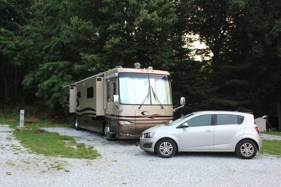 Our site is gravel, back in, not even long enough for the rig and the car, and of course it isn’t level. Satellite friendly? South is in the direction of the trees in the back so that’s that. Not one satellite can be found. Of course the price of the site requires you to give an arm and a leg. But folks they know they are the only game in town so you really have no choice.