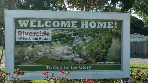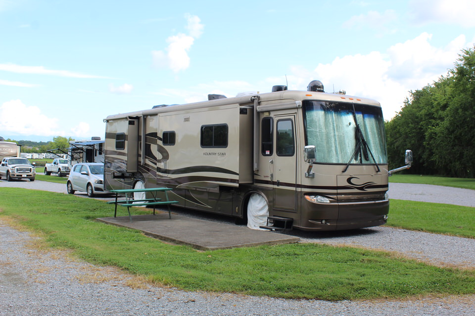 We’re at Riverside RV Park and Resort in Sevierville, TN. Our spot is in the back in a football size area that is all pull-throughs. Our site is really nice. It has a base of hard packed gravel, it is reasonably level, and all utilities are right off the wet bay. And we again have satellite!
