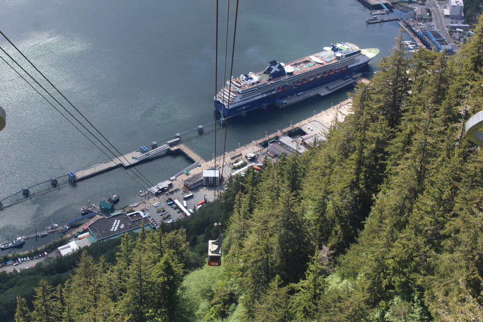 It is a six minute ride of 1,800 feet up to the Mountain House. The literature claims that it is the most vertical tram in all of Alaska. I believe it!